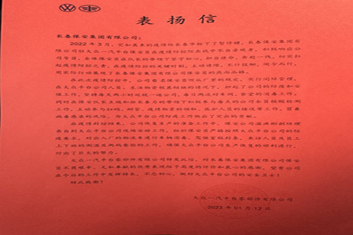 ? ? ? ? ? 在收到表揚(yáng)信后,溫洪彬副經(jīng)理表示,在今后的工作中,他將帶領(lǐng)全體駐勤保安員繼續(xù)堅(jiān)持以客戶單位滿意為宗旨,不斷完善服務(wù)細(xì)節(jié),顯著提升安保服務(wù)能力和水平,把疫情防控和安保工作做得更好,做好安全衛(wèi)士,為有力保護(hù)好大眾一汽平臺(tái)零部件有限公司的財(cái)產(chǎn)作出應(yīng)有貢獻(xiàn)。